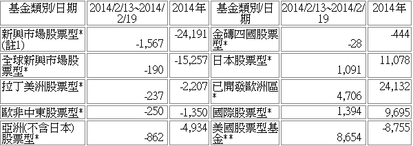 註1:新興市場股票型基金=全球新興市場股票型+拉丁美洲股票型+歐非中東股票型+亞洲(不含日本)股票型+金磚四國股票型基金資金流量合計數。