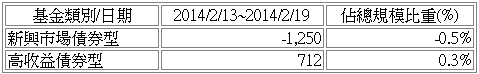 就債券型基金而言,根據研究機構EPFR統計2014/2/13~2014/2/19基金資金流向報告指出,淨流入高收益債券型基金規模達24億美元,為去年十月中旬以來最大的單周淨流入,其中美國高收益債券型基金吸引7.12億美元的淨流入,歐洲高收益債券型基金吸引資金規模達17.29億美元,為統計以來第三大單周淨流入。新興國家債券型基金最近一週(截至2/19)再流出逾12億美元,雖然仍偏高量,但已連三週減緩。