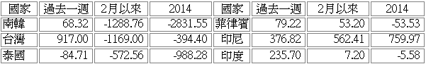 即使受到氣候嚴寒影響經濟數據表現,投資人對於復甦前景依然樂觀,根據研究機構EPFR統計2014/2/13~2014/2/19基金資金流向報告指出,過去一週美國股票型基金獲資金淨流入86.54億美元,今年來最大單週淨流入;歐洲股票型基金獲資金淨流入47.06億美元,連續34週淨流入。各類型新興市場股票型基金總計淨流出15.67億美元,連17週淨流出,惟淨流出金額趨緩(附表一)。