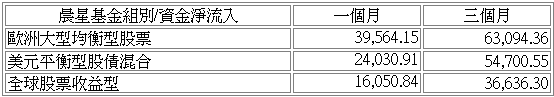 另外,基金研究機構晨星(Morningstar)公佈2014年一月資金流向統計,以歐洲大型均衡型股票型基金組別的資金淨流入金額為最高,一月份累計有395.64億台幣資金流入,其次則為美元平衡股債混合型(淨流入240.3億台幣)以及全球股票收益型基金(淨流入160.5億台幣,附表二)。