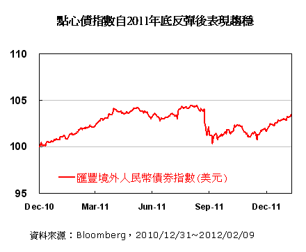 1月份已恢復到長期緩步上漲的趨勢,依照匯豐離岸人民幣債券指數來看,