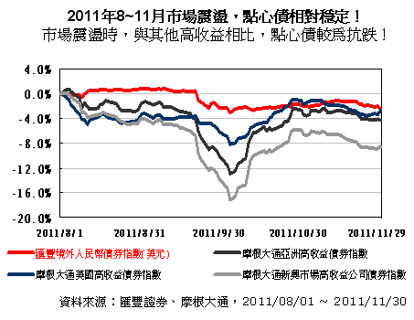 陳培倫進一步說明:我們持續看好點心債券市場的原因來自於三方面:一是目前點心債券的平均殖利率為4.3%,表示目前點心債券價格偏低,正是逢低承接的好時機;二是近期美國聯準會議中也宣布仍舊維持低利政策至2014年底以刺激景氣復甦,因此全球資金正積極地尋找收益較佳的投資標的,點心債券正是首選;三是中國政府對點心債市的全力支持,如此的官方策略,將可為投資人打造一個中長期穩定發展的投資環境。