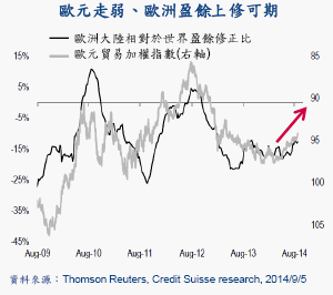 Suisse/2014年9月5日),故歐元貶值將提升企業獲利能力,推升企業盈餘修訂比(左下圖)。此外,根據歷史經驗,歐元每貶值10%,將使企業盈餘成長8%,並嘉惠歐元區名目GDP成長1.2%(資料來源:Credit