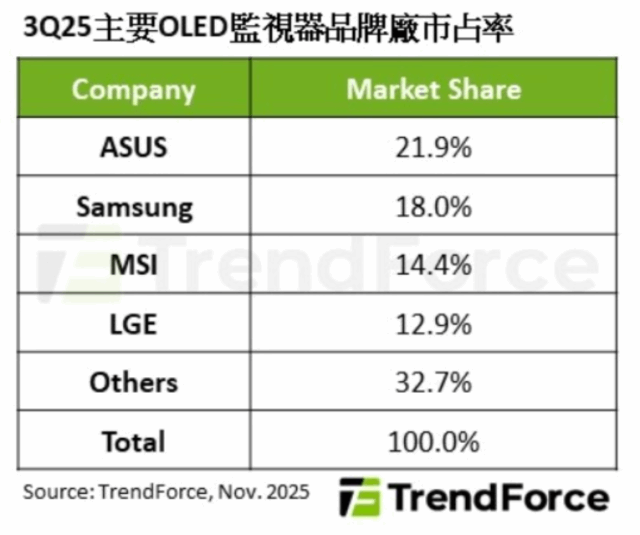 集邦表示,第三季OLED監視器出貨排名前二名順序對調,華碩(2357)市占攀升至21.9%,首度拿下OLED監視器單季出貨冠軍,該公司產品線布局完整,除了廣受好評的ROG電競顯示器外,亦率先推出針對創作者的ProArt專業OLED系列,以及多款創新的攜帶型(Portable Monitor)與折疊雙螢幕監視器,完整的產品策略與持續創新,奠定ASUS在中高階市場的專業形象,預估其2025年全年OLED監視器出貨也將登上全球第一。