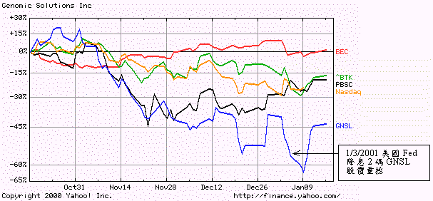 Biosciences(PBSC)等,在2001年初的表現顯然也受到整個生技類股(BTK)拖累的影響。尤以Genomic Solutions Inc.