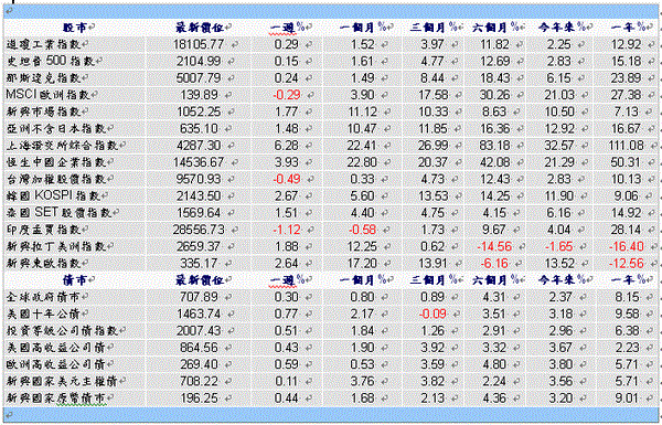 新興市場:美國零售銷售等經濟數據不佳,中國第一季GDP成長率放緩至7%,2009年首季以來最低水準,且三月份零售銷售與工業生產等數據不如預期,加上標準普爾調降希臘債信評等至CCC+,市場也擔憂希臘債務違約,但受惠美元走弱,商品價格反彈利多,資金回流新興市場,帶動新興股市週線上漲。總計過去一週摩根士丹利新興股市指數上揚1.75%、摩根士丹利新興市場小型企業指數上揚1.49%。