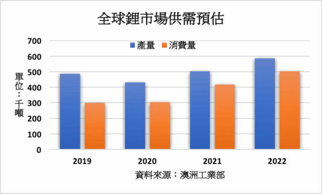 澳洲工業部報告預估,2021以及2022年,全球鋰產量以及消費量都可望有兩位數的增長。2021以及2022年,全球鋰產量預估將分別年增16.7%與16.1%,達到50.3萬噸與58.5萬噸;鋰消費量則預估將分別年增36.6%與20.5%,達到41.7萬噸與50.2萬噸。