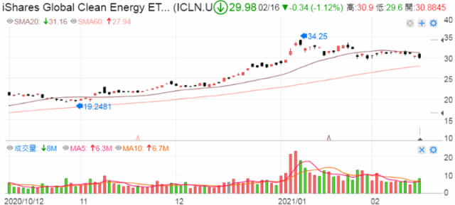MoneyDJ iQuote報價顯示,iShares全球乾淨能源指數ETF(iShares Global Clean Energy ETF、代號ICLN.US),16日下跌1.12%、收29.98美元。和1月7日波段收盤高點的33.41美元相比,股價拉回10%。
