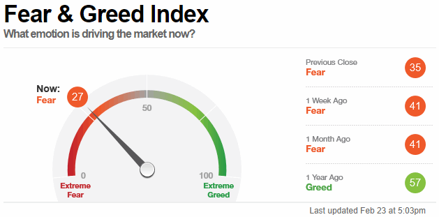 值得注意的是,CNN恐懼貪婪指數(CNN Fear & Greed Index)顯示,2月23日投資人態度處於恐懼(Fear)狀態,指標來到27點,低於22日的「恐懼」(35點),一週之前也是恐懼(41點)。(見左圖)