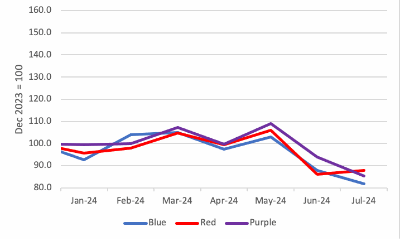 統計顯示,無論是紅州、藍州或紫州,今(2024)年新開職缺都不如去年。不過,今年多數時候,紫州的新開職缺都高於藍州或紅州,但最近也開始減少。(見下圖)