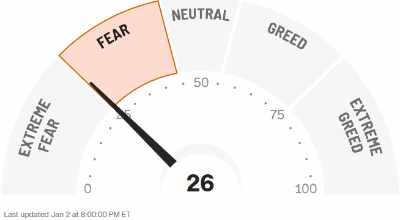 值得注意的是,CNN恐懼貪婪指數(CNN Fear & Greed Index)顯示,1月2日投資人態度為「恐懼」,指標下滑至26點,即將落入「極恐懼」,一個月前還在貪婪區(56點)。