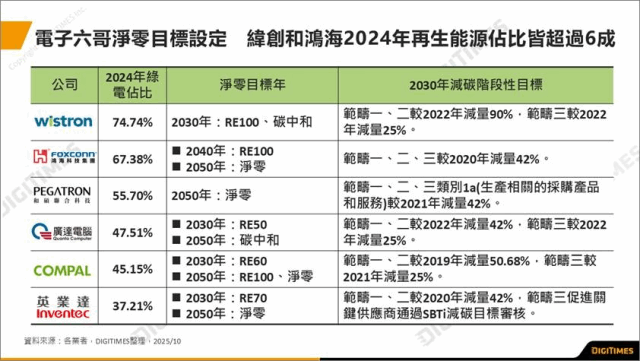 台灣電子六哥為全球ICT供應鏈的重要夥伴,電子六哥不僅已設定2050年淨零目標,更將2030年階段性減碳目標從範疇一、二,延伸到範疇三供應鏈端。其中,又以緯創(3231)最具企圖心,規劃提前於2030年達成RE100,且2024年再生能源佔比更位居電子六哥首位,再生能源佔比達74.74%,其次為鴻海(2317)67.38%(附表)。