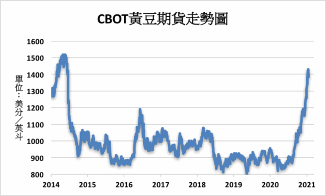 中國海關上週公布的數據也顯示,2020年12月,大陸黃豆進口量752.4萬噸,較前月減少21.5%,較上年同期減少21%。2020全年,大陸黃豆進口量年增13.3%至1.003億噸,首次超過1億噸關卡並創下新高紀錄。大陸是全球最大的黃豆進口國,佔全球黃豆貿易量約六成比重。