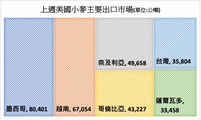 美國農業部8月11日公佈的每週出口檢定報告顯示,截至8月7日當週,美國小麥一週出口檢定量為365,486公噸,佔穀物出口總量的15%;較前週減少47%,較上年同期減少45%,主要出口市場為墨西哥(80,401公噸)、越南(67,054公噸)。自6月起的2025/26年度小麥累計出口量年增2%至4,366,891公噸。美國農業部7月報告預估2025/26年度小麥出口量為2,313萬噸,較前月報告預估上調68萬噸。
