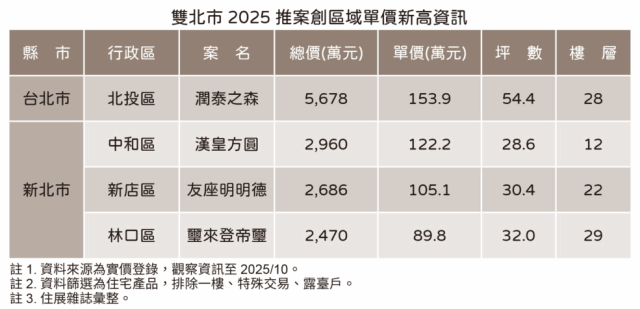 2025年房市走弱,不過仍有新案一推出就創區域單價新高,不景氣也爭氣,住展雜誌彙整住宅產品的實價資訊,排除露臺戶造成單價拆算過高的偏差,今年在台北市北投區,與新北市中和區、新店區、林口區分別有「潤泰之森」、「漢皇方圓」、「友座明明德」、「璽來登帝璽」各來到單坪153.9萬元、122.2萬元、105.1萬元和89.8萬元登上區域之首。