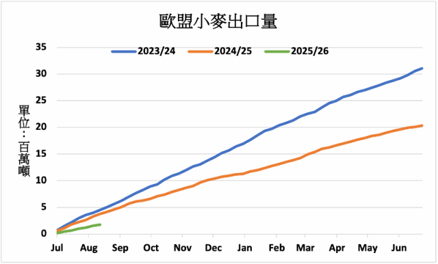 歐盟執委會8月19日公布,截至8月17日,7月起的2025/26年度,歐盟小麥出口量累計為1,779,890公噸,較上年同期的3,761,158公噸減少53%,主因自2024年初以來法國出口數據缺失的影響。大麥出口量累計為1,253,758公噸,較上年同期的1,163,623公噸增加8%。玉米出口量累計為44,471公噸,較上年同期的139,319公噸減少68%。