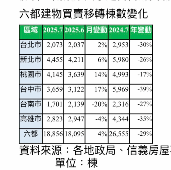 六都7月建物買賣移轉棟數約1.9萬棟,其中,台北市7月移轉為2073棟,年減30%、月增2%,新北市為4455棟,年減26%、月增6%,桃園市4145棟,年減17%、月增14%,台中市3659棟年減39%、月增17%,台南市1701棟,年減27%、月減20%,高雄市7月建物買賣移轉棟數2823棟,年減35%、月減4%。