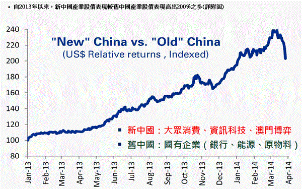 自2013年以來,新中國產業股價表現較舊中國產業股價表現高出200%之多,並帶動相關類股2013年股市表現大放異彩,包括資訊科技、醫療保健與可望受惠於內需消費提升的循環消費類股,近期由於舊中國產業股價過低而有所反彈,然長期趨勢仍支持新中國產業表現。