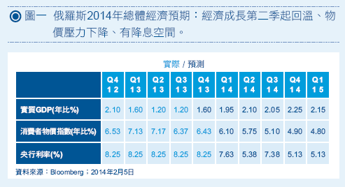 統計券商機構之預測,2014年普遍預估俄羅斯經濟成長平穩,且較2013年有所改善,加上物價壓力明顯下降,降息可期(圖一),將能促進成長回溫。