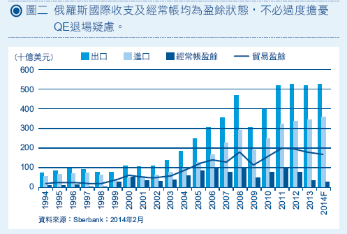 經常帳出現盈餘:俄羅斯受益於石油出口,貿易帳及經常帳均出現盈餘(圖二),外匯儲備豐厚,不像部分新興國家依賴資本進口,故不必過度擔憂QE退場疑慮。