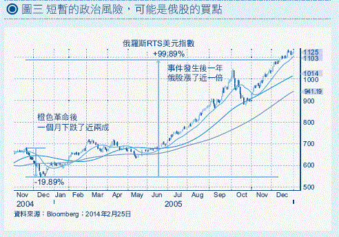 不過烏克蘭的東西對立自1991年脫離蘇聯獨立後就沒斷過,若要以史為鑒,可以追溯到2004年11月開始的橙色革命,當時俄羅斯股市也遭到波及,事件發生後一個月內,下跌了近兩成(圖三)。而未來若選舉與協商能和平進行,並未釀成內戰與違約事件,政治事件所造成的俄股短暫回檔,往往不需太過擔憂,從橙色革命發生後一年內俄羅斯RTS美元指數累積近一倍的漲幅(圖三)就可印證。