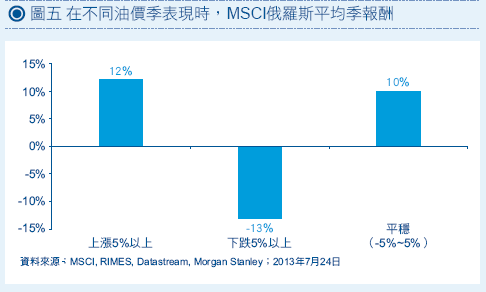 高檔油價嘉惠俄股表現:市場普遍預估,2014年布蘭特原油價將維持在100元以上的歷史高檔區間(圖四),進而嘉惠俄股表現(圖五)。另外,俄羅斯政府在編製2014年預算時,是將油價訂在每桶93美元,因此若油價能持續守在百元之上,政府將有更大的空間去運用財政政策來刺激成長。