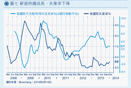 消費持續堅穩:由GDP成長的細項分析可知,消費為支撐GDP成長的主要因子。而美銀美林預估冬季奧運將湧入30萬觀光客,且在俄羅斯工資水準不斷提高(莫斯科市最低工資自2014年1月1日起,由1.22萬盧布增至1.26萬盧布)下,消費將持續成為俄羅斯經濟成長的推手。