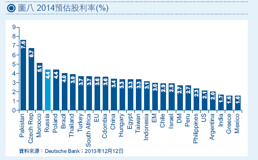 股利率明顯提高且未來仍會持續:德意志銀行預估,2014年俄羅斯企業股利率預估會接近4.4%,高於新興市場的3.0%以及成熟國家的2.6%(圖八)。另外,俄羅斯企業發放率會再調高至25%,政府還研擬國營企業發放水平還可能到達35%,此舉將吸引價值型的投資資金進駐。