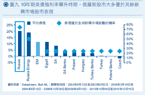 股優於債的市場氛圍有助於俄股表現:自今年1月起QE開始陸續退場,美債殖利率攀升成為市場共識,投資氛圍將逐漸轉換成股優於債。而過去經驗顯示,當殖利率開始攀升初期,新興市場股中以俄羅斯表現最佳(圖九)。