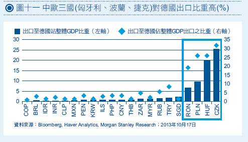歐洲在德國帶領之下持續復甦,而中歐三國(匈牙利、波蘭、捷克)對德國出口比重高(圖十一),將進而受惠於歐洲的復甦。另外,中歐三國通膨壓力比其他新興市場小,將有利於這三小國的經濟成長。不過,中歐部份股票有出現評價過貴的問題,我們將用精選個股的方式受惠歐洲之復甦。