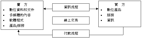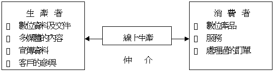 另一種對電子商務的看法是,透過一仲介者,將數位輸入加值(value-added)後轉給消費者的處理過程(參見圖二)。典型的例子,當投資人在線上交易(online trading)而線上證券商將原始證券價格報價經過程式轉化成線圖或提供分類產業的報告加上及時的新聞資訊,提供給線上下單的投資人。券商利用數位資料輸入(價格報價)經過處理、加值化(轉為線圖),給投資人(消費者)來利用此資訊做出更精確的決策。