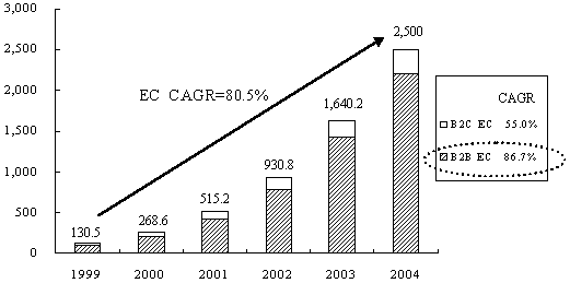 B2B指的是企業對企業的商務模式,而其市場規模究竟有多大呢?根據Forrester Research估計(表一),B2B電子商務模式將會比B2C電子商務模式的規模高出8倍;到了2003年B2B電子商務模式將會暴增至1.8兆美元,這個金額大約是美國目前交易金額的9%,大概相當於英國或義大利的國民生產毛額;而到了2006年,全美交易金額的40%將以B2B電子商務模式來完成;至於市場研究公司GartneGroup表示,受到電子市場(eMarket)廠商如Chemdex、VerticalNet、Altra Energy Technologies、Instill、PlasticsNet.com及CommerceOne及Marketsite.net蓬勃發展,全球B2B市場將快速成長,2003年將會達3.95兆美元;2004年全球市場交易規模為105兆美元,而B2B就佔了其中的7%;而IDC預估電子商務市場規模將從1999年的1,305億美元,飛躍成長為2004年的2.5兆美元,其年複合平均成長率高達86.7%,可見其高度成長性(參見圖三),B2B的商業模式(Bussiness Model)將是目前電子商務中最重要的模式,而電子交易市集(eMarketPlace)則是在美國Nasdaq股價大幅修正電子商務公司(B2C、B2B)股價後,又有研究機構相當看好其未來發展性,將在下節繼續探討。總言之,B2B就是企業對企業,藉著網際網路的訊息流通,使企業與企業之間的交易訊息達到管理的自動化、節省成本、增加效率,而B2B具有代表性的公司有Commerce One、 Ariba等等。