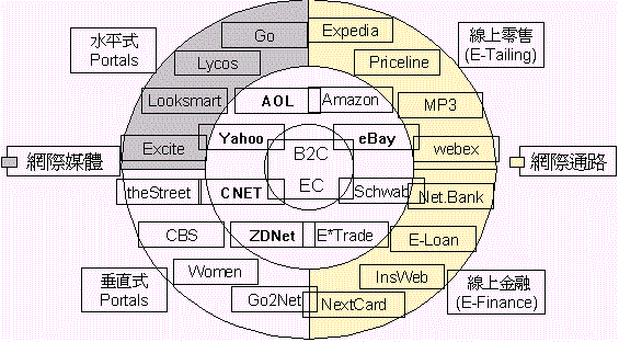 資策會MIC則將整個B2C EC 市場分為二大區隔,分別為網際媒體與網際通路(參見圖四),其中網路媒體再區分為水平式與垂直式Portals,水平式Portals以搜尋引擎與入口網站為代表,主要業者如AOL、Yahoo以及Excite等,垂直式Portals 則以目的型網站為代表,例如資訊科技網站CNET、專業財經網站 theStreet.com以及女性社群網站Women.com等,由上可知,水平式Portals均為內容仲介者,垂直式Portals則深耕於內容深度。網際網路除了具有「媒體特性」之外,還有傳統媒體(如電視、廣播及報紙等)所缺乏之「通路特性」,也就是透過網際網路,業者可以直接銷售產品或提供金融服務給消費者,因此網際通路可再區分為線上零售(E-Tailing)與線上金融(E-Finance)二大類,線上零售代表業者有網路書店Amazon及線上拍賣eBay等,線上金融則以前二大網路券商e*Trade及Charles Schwab(嘉信理財)為代表。
