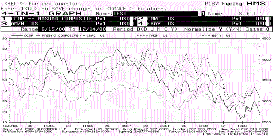 自從4月份美國Nasdaq股價開始大幅修正,投資人對於公司獲利性的重視開始超越其營收成長性,個股股價能否表現全看公佈的財務報表能否達成或超越分析師所做的預測,短期無法獲利的公司立刻受到投資人的質疑且股價立刻重挫,市場已經不能容許連續虧損的公司。B2B代表Commerce One修正幅度高達70%,股價由83.75跌到25.875;B2C代表Amazon修正幅度達61%,股價由49.4375跌到19.375;C2C代表eBay修正幅度達63%,股價由78.1875跌到29.25。與近3個月NASDAQ修正幅度相較,高點4232向下修正到2534點跌幅約40%,電子商務代表公司股價的表現動輒跌幅6?7成,確實可以發現投資人已對電子商務吹噓的前景以嚴厲標準(是否能在短期損益平衡、財務結構是否健全)來衡量。