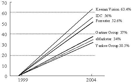 因此各大市場研究機構一致的看法是「電子交易市集成為企業間電子商務的主力」(參見圖六),尤其是Forrester、IDC、Keenan Vision等三家研究單位更看好電子交易市集將在2004年佔企業間電子商務市場規模的50%以上。再根據IDC的估計,在企業間電子商務市場規模中,電子交易市集將從1999年的2.47%逐漸成長到2004年的56%,也就是有超過一半以上企業間電子商務市場將會是電子交易市集的天下,而這5年間複合成長率高達248.4%