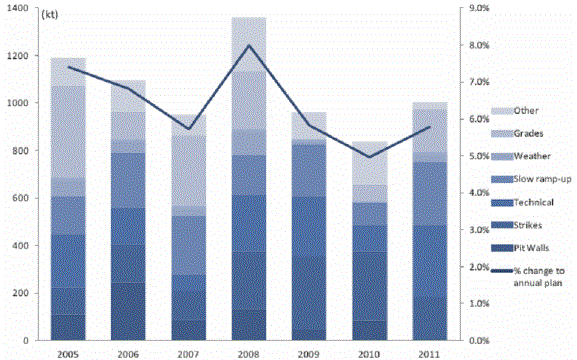 圖一、2005~2011年全球銅礦供需短缺圖