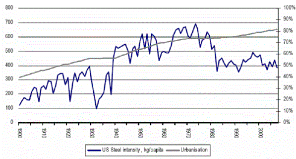 另外,以目前中國城市化還未達高度成熟的階段,中國未來數年對工業金屬的需求勢必將維持在高檔。以美國為例,美國在經歷二次世界大戰後開啟了戰後重建工作,每人鋼鐵平均年消費量在1973年達到每年700公斤的高峰(圖二),之後才慢慢逐年往下滑。當時美國城市化的程度為75%,目前中國每人年消費鋼鐵量約400公斤