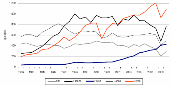 圖三、全球主要國家鋼鐵每人每年平均消費量
