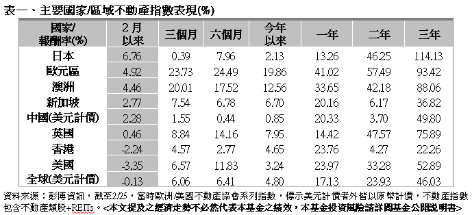 美國房市數據偏弱,加以投資人擔憂美國聯準會升息時點可能提前,壓抑美國不動產指數轉趨震盪,所幸中國降準、澳洲降息,輔以歐日不動產企業財報亮麗,帶動歐亞不動產走勢,支撐全球不動產指數於二月份高檔震盪,統計富時歐洲/美國不動產協會已開發國家指數本月來小跌0.13%,累計今年來仍有4.80%漲幅(表一,彭博,截至2015/2/25)。