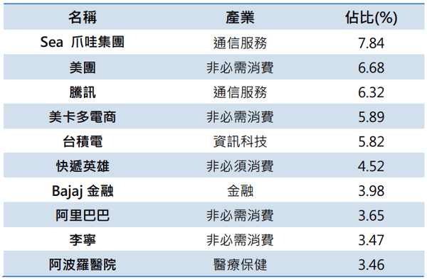 此基金佈局多個投資主題,包括電子商務、餐飲外送、金融科技、半導體產業、知名運動品牌和中國軟體即服務企業等,坐享新興市場內需成長潛力。由於投資主題多達十餘項,相當多元分散,充分掌握新興市場創新題材。