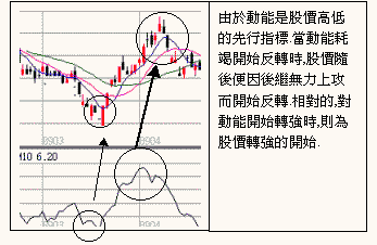 股價的漲跌除了有趨勢(方向)要素外,另一重要的因子便是股價的動能,或是股價移動的速度,一般而言,如果 上漲趨勢或下跌趨勢形成,則股價便會往趨勢方向前進,但當趨勢反轉形成前,股價往原趨勢方向前進的速度便 會先減慢,最後停止,繼而才往反方向前進。因此就理論上而言,股價進行的速度是趨勢方向的先行指標。當趨 勢反轉前,股價前進的速度應該先反轉。