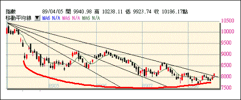 緩的趨勢線為扇形線。而整個價格型態發展至此,由擺盪已漸趨平緩可知整個修正的走勢已大致完成,因此,