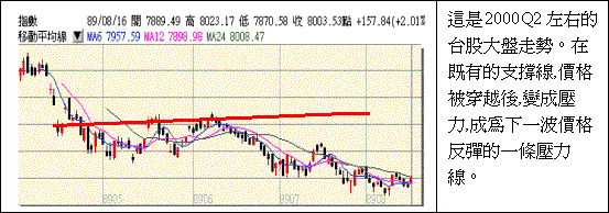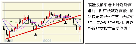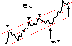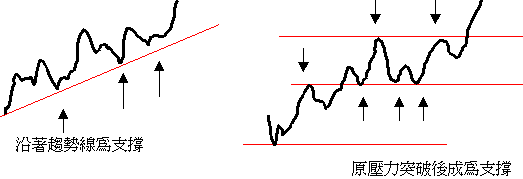 趨勢線為支撐及壓力的所在由於價格走勢有其趨勢,因此所形成的波峰或波谷將隨著長期趨勢而改變,這意味 著存在於投資人心中的理想供給價位或需求價位亦會隨著時間趨勢而有所修正。因此,數個波峰或數個波谷將 可描繪出投資人心中對供給價位或需求價位之變動趨勢,這即是趨勢線所表現的支撐或壓力線。