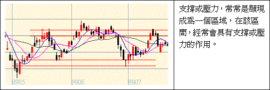判斷支撐與壓力,是研判價格走勢轉折的重要工具。而在應用上,趨勢線、價格型態的頸線以及整數心理關卡 等,都是支撐或壓力的出現區。而支撐或壓力在概念上,是一個區域而不是特定點,因此在繪製支撐壓力線時 ,有時可發現以一個支撐區域或壓力區域來表現將更實用。
