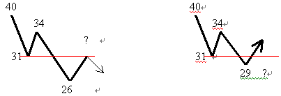 目前價位與支撐/壓力區域的距離,是其強度的重要因素如果價格由40元開始下跌,跌到31元後漲到34元,之 後再跌到26元時,這個時候,31元對26元而言將是很明顯的壓力,但如果價格是從34元跌到29元,則31元 的壓力將不會太明顯。