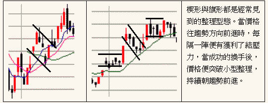 認清其特質,楔形結構的價格波動較緊密,且二條趨勢線斜率明顯向上或向下。因此若發現趨勢線的其中一邊趨近 水平,則這樣的排列應該都是直角三角型態。