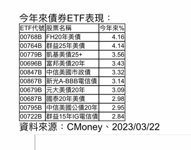 群益投信今(22)日指出,近期國際股債市再度不安寧,先有美國矽谷銀行倒閉事件,後續又傳來瑞士信貸經營問題,市場恐慌情緒再現,風險性資產價格出現較大的波動,使得部分資金湧向美債與黃金等安全係數較高的避險資產,觀察今年來債券ETF表現(參見附表),前十強當中以長天期美債ETF佔據最多席次,前二強的產品分別為FH20年美債、群益25年美債、漲幅均在4%以上,且受益人數相較去年底也呈現正成長態勢。