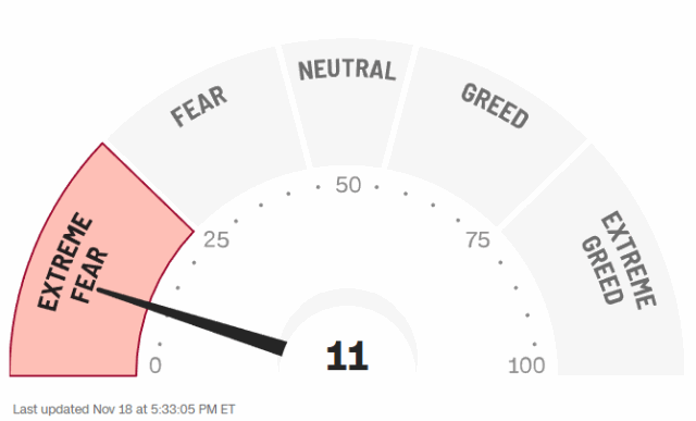 市場情緒極為低迷。CNN恐懼貪婪指數(CNN Fear & Greed Index)顯示,11月18日美股投資人的態度為「極恐懼」、指標下降至11點,低於17日的14點與一週前的「恐懼」(34點)。