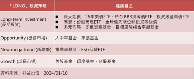群益投信指出,2024年也是龍年,在股債投資契機兼具之下,第一季建議投資人可採用「LONG」配置策略來因應,L代表Long-term investment,即適合作為投組長期持有的穩健收益型產品,包括具穩健高息特色的台股高息ETF、全球優先順位非投資級債,又或是透過跨資產、跨試場配置的多重資產基金、目標風險組合基金來參與行情,以及升息尾聲下受惠程度大的長天期債,包括25年美債ETF、ESG BBB投等債ETF、投資級產業債ETF。