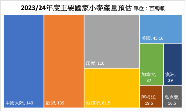 2023/24年度,全球小麥產量預估將年增150萬噸至創新高的7.9億噸,除了美國以外,包括阿根廷、加拿大、中國大陸、歐盟與印度等小麥產量也都可望增長,澳洲、俄羅斯、烏克蘭以及哈薩克等小麥產量則預期將會下滑。其中,阿根廷小麥產量預估較上年度嚴重受旱的1,255萬噸增長55%至1,950萬噸,加拿大小麥產量也有望創下新高達3,700萬噸;烏克蘭小麥產量則預估將年減21%至1,650萬噸,主要受到戰爭的影響。